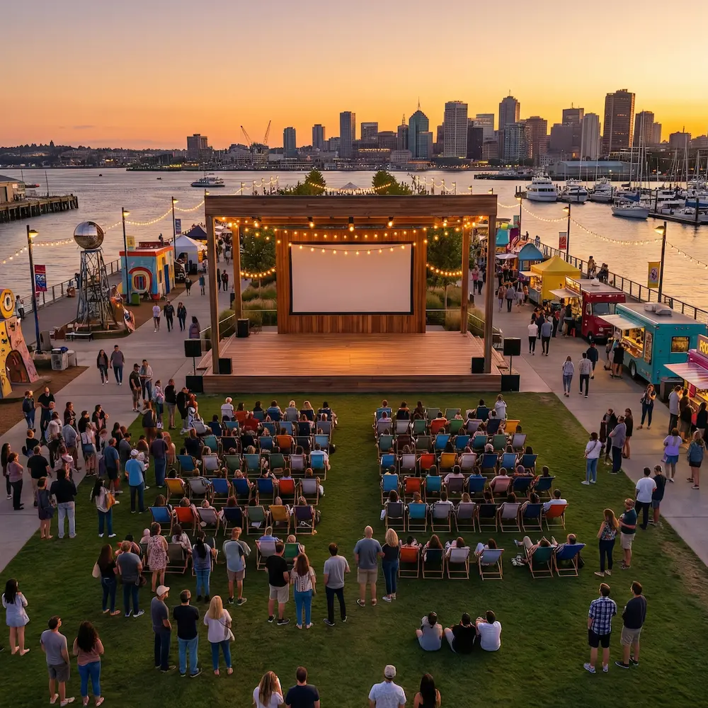 A scenic waterfront promenade with a raised stage and open lawn, perfect for sunset events and outdoor performances.